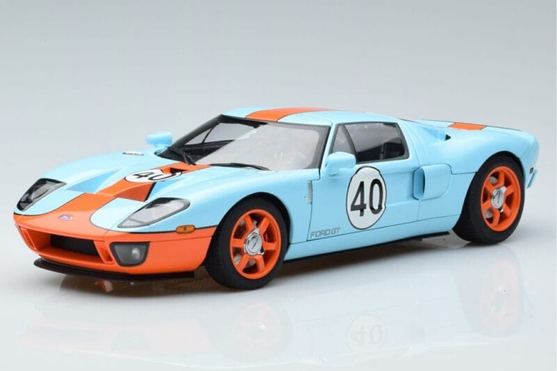 The Ford GT Coupe Gulf Livery AUTOart 1:18 is crafted from Diecast. Die-cast zinc alloy body with detailed plastic parts, rubber tires, and high-quality paint finish. Die-cast models are known for their weight, durability, and realistic feel.
